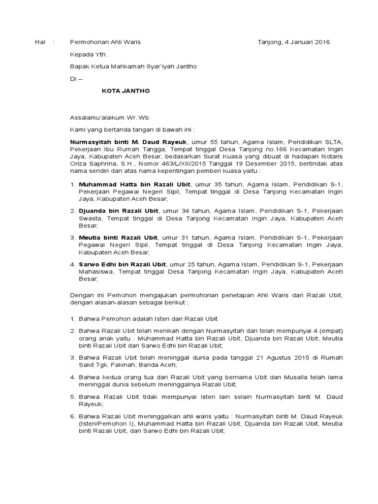 Surat keterangan ahli waris demikian surat permohonan pengunduran diri pembatalan haji ini saya sampaikan. Berprofesi sebagai pengajar menjadi hal yang sangat mulia dan baik karena bisa menyebarkan. Contoh surat pernyataan ahli waris tunggal. Contoh surat keterangan kesepakatan pembagian harta waris. Sementara surat keterangan yang dikeluarkan oleh kelurahan nanti.