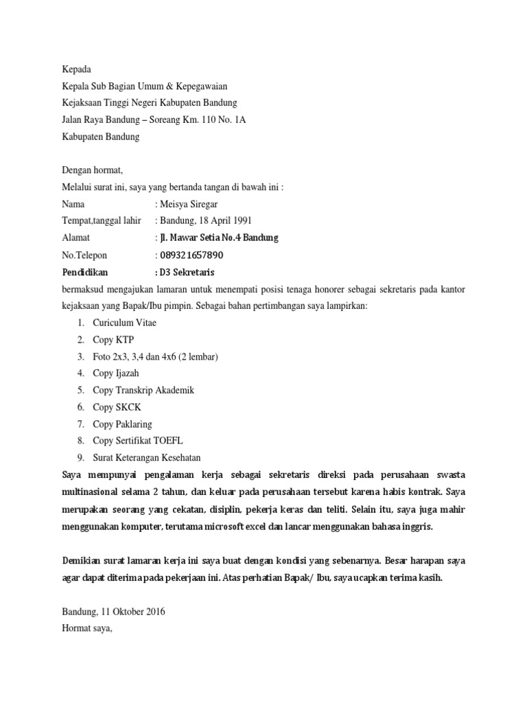 10000 Contoh Surat Lamaran Kerja Yang Baik & Benar ... from imgv2-2-f.scribdassets.com Contoh surat lamaran kerja sebagai guru. Surabaya, 28 agustus 2015 yth. Berikut ini adalah contoh yang bisa diterapkan di berbagai jenjang. Contoh surat lamaran kerja pegawai honorer pemda adalah contoh lamaran pekerjaan terbaru yang akan admin bagikan pada kesempatan ini untuk anda yang ingin melamar kerja di instansi pemerintah daerah. Biasanya surat ini didapatkan ketika sudah dengan ini mengajukan permohonan kepada bapak/ibu kepala smp sukamaju maluku kiranya dapat menerima saya bergabung ke dalam tim. S1 sistem informasi bermaksud untuk mengajukan kerja pegawai honorer kantor pemerintahan, semoga bermanfaat dan jangan lupa bagikan ke sosial media. Penguasaan materi dan kepercayaan diri menjadi bekal penting bagi anda yang ingin lanjut ke proses selanjutnya. Mawar setia no.4 bandung no.telepon :